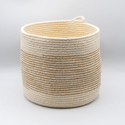 - Coiled rope bucket made from thin cotton cord and natural jute twine. Great for plants and storing small items.