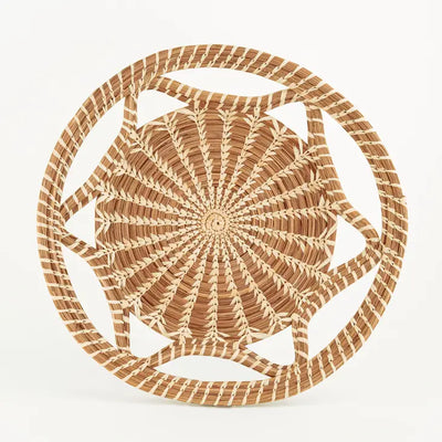 The intricately hand-stitched center of the Mari basket radiates out to an undulating decorative rim. Created from pine needles and raffia, this basket is great for display or can be used as a serving tray, with or without a plate. Approximately 11.5"W x 1"H