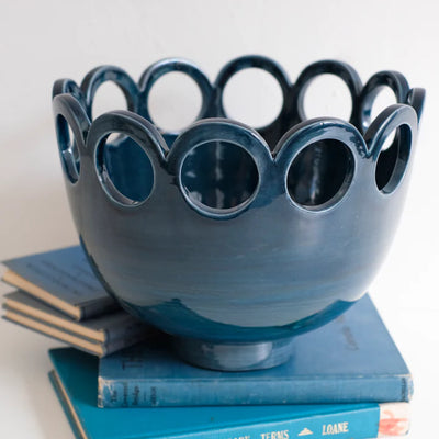 This bowl is hand thrown with low-fire earthenware. After curing for several days, its form is smoothed and prepped for the carving process. Each perforation is tooled, carved, and cleaned several times in order to create a finished surface. After a bisque firing, it is glazed three or four times and fired a final time.