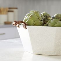 With its ivory crackle glaze and tan woven leather straps the Taylor Centerpiece is highly textural and tonally subdued. A multifaceted ceramic silhouette dispenses with the obvious and traditional round bowl shape to offer something more graphic and compelling. The Taylor Centerpiece lives happily on a dining table kitchen counter or in an entry hall with planted bulbs.