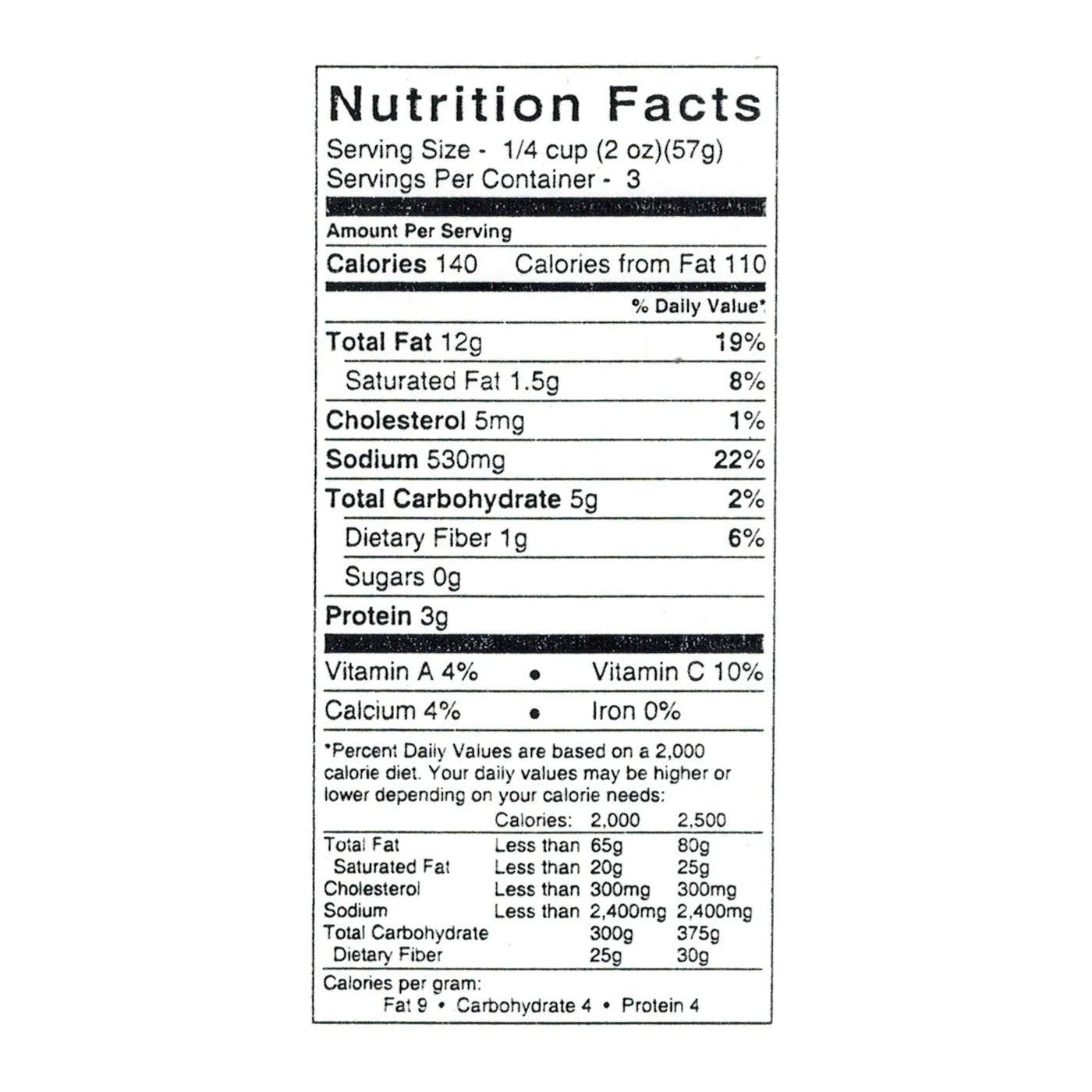 Ingredients: Artichokes, Parmesan cheese, Extra virgin Olive Oil and expeller-pressed canola oil, Lemon juice, Parsley, Fresh Garlic, salt and pepper.