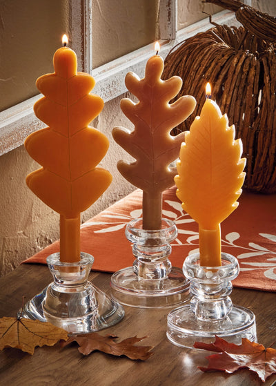 Embrace the beauty of autumn with this set of three fall leaf taper candles. Each candle features a unique leaf pattern, adding the perfect touch of fall to your home.