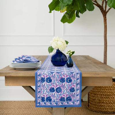 100% Cotton. Machine wash cold. Tumble Dry Low. Made in India. Each table runner measures 14" x 108"