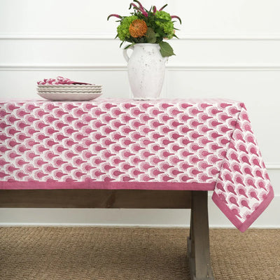 Hand block printed with a feather pattern in vibrant shades of pink, this tablecloth is sure to bring a perfect touch to any gathering.