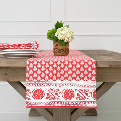 100% Cotton. Machine wash cold. Tumble Dry Low. Made in India. Each table runner measures 14" x 108"